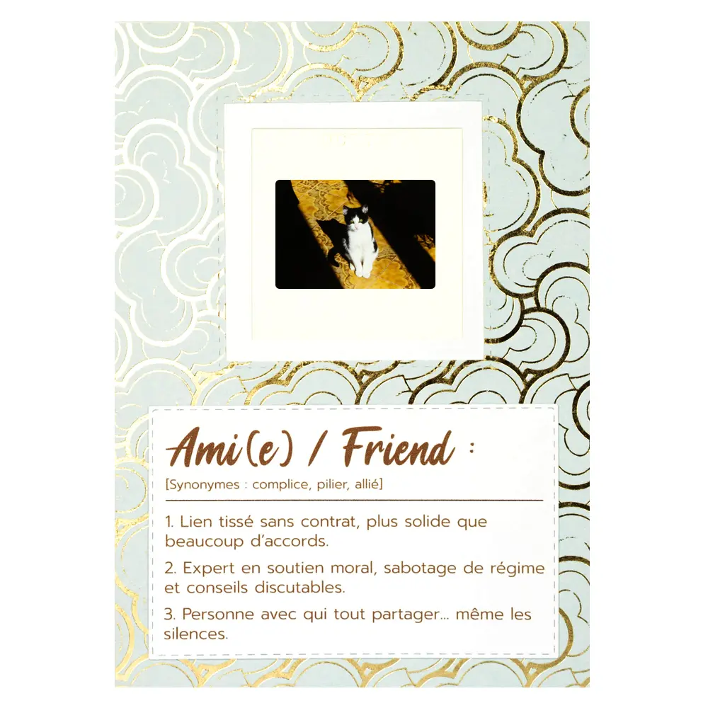 Un chat, un rayon de soleil, un peu de douceur… pas besoin de plus pour résumer certaines amitiés. C’est le genre de carte qu’on envoie sans raison particulière, juste pour dire “je pense à toi” ou pour faire sourire quelqu’un qui compte… et qui aime les chats ! Elle convient aussi bien à une amie proche qu’à une collègue sympa ou une personne chère à qui on veut envoyer un peu de chaleur. - Une pièce unique fabriquée à Trévoux