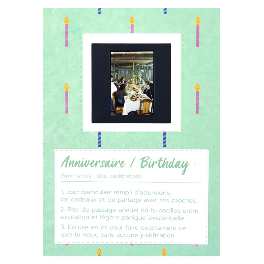 C’est l’heure de la traditionnelle photo de famille autour du gâteau d’anniversaire. Plongez dans l’ambiance vintage des années 80 avec cette carte unique, issue d’une véritable diapositive ancienne.