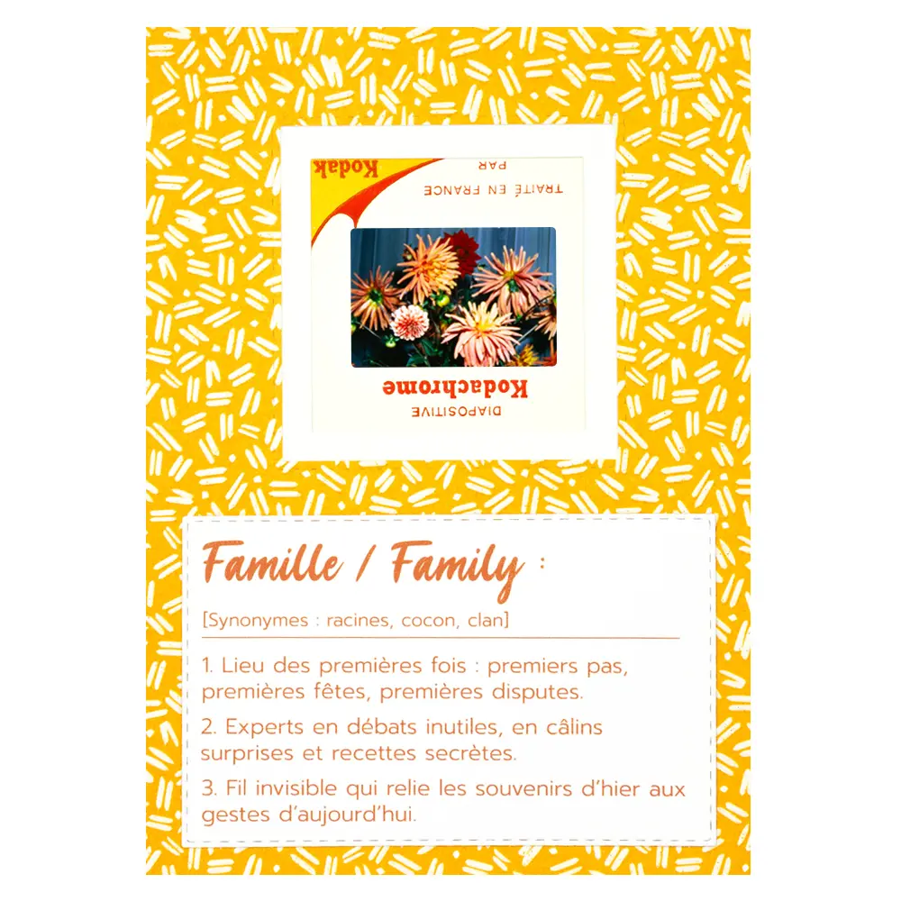 Chaque carte Slide Up est réalisée à la main, dans mon atelier à Trévoux, à partir de vraies diapositives anciennes, chinées une à une pour leur lumière et leur authenticité. Le papier est choisi avec soin pour mettre en valeur la transparence et les teintes naturelles de la photo, ici, un bouquet lumineux qui évoque la joie, la vie et la transmission familiale. Résultat : une carte artisanale française, unique, à mi-chemin entre la carte souvenir et le petit objet déco. Les cartes Slide Up ne sont pas de simples cartes, mais des fragments d’histoires à offrir, pour marquer les moments importants de la vie. - Quelques idées de mots à glisser aux jeunes grands-parents
