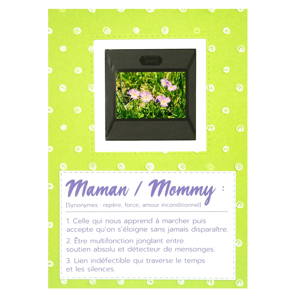 Fabriquée à la main à partir d’une vraie diapositive d’époque, cette carte florale originale distille calme et délicatesse.