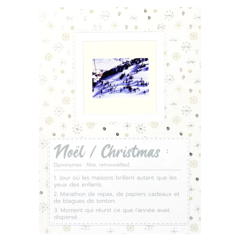 Sous la diapositive, une scène lumineuse : des montagnes enneigées à perte de vue, un ciel bleu d’hiver et ce sentiment de paix qu’on ne trouve qu’à la montagne. Le papier au motif de boules de Noël turquoise et dorées apporte une touche de modernité joyeuse, rappelant les décorations suspendues dans les sapins et les vitrines. Cette carte artisanale de Noël mêle la pureté du paysage à la chaleur des souvenirs partagés. Une invitation à respirer, à s’émerveiller, à se recentrer sur l’essentiel.