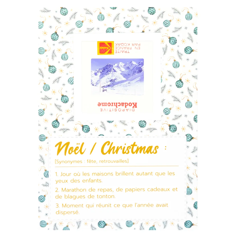 Fabriquée à la main à partir d’une véritable diapositive vintage, chaque carte Slide Up capture une image authentique du passé et la transforme en petit trésor à partager. Une pièce unique, à envoyer pour souhaiter un joyeux Noël ou à garder pour décorer la maison, comme une mini fenêtre ouverte sur l’hiver. - Quelques idées de mots à glisser dedans
