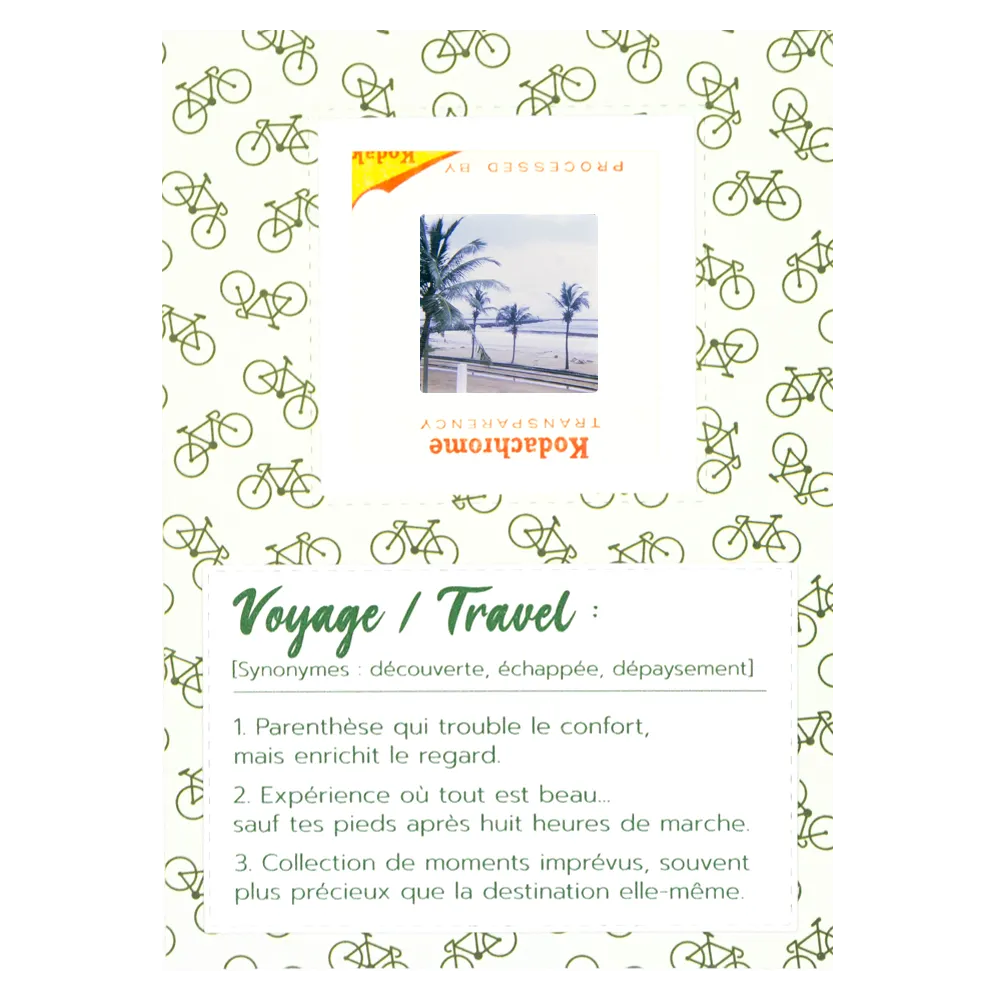 À offrir pour célébrer un esprit aventurier, accompagner une cagnotte de voyage ou simplement envoyer un souffle d’ailleurs à ceux qui aiment pédaler loin… très loin.